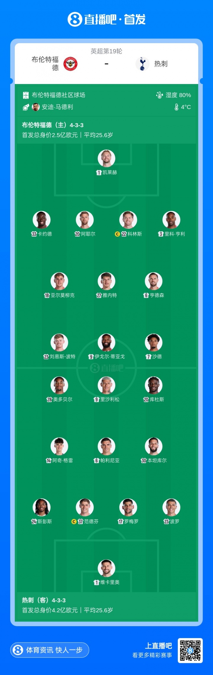 1月2日讯 北京时代1月2日4:00,英超第19轮,布伦特福德vs热刺。赛前两边公布了本场比赛的首发威望。
