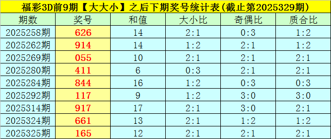5、鄙人期奖号中,号码大小比为:2:1、1:2、2:1、0:3、1:2、1:2、2:1、2:1、2:1,号码大小比总比例为13:14,本期珍视小 号热出,看好大小比为1:2。