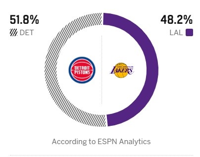 詹姆斯41岁诞辰夜!ESPN瞻望明日胜率:湖东谈主48.2% 活塞51.8%