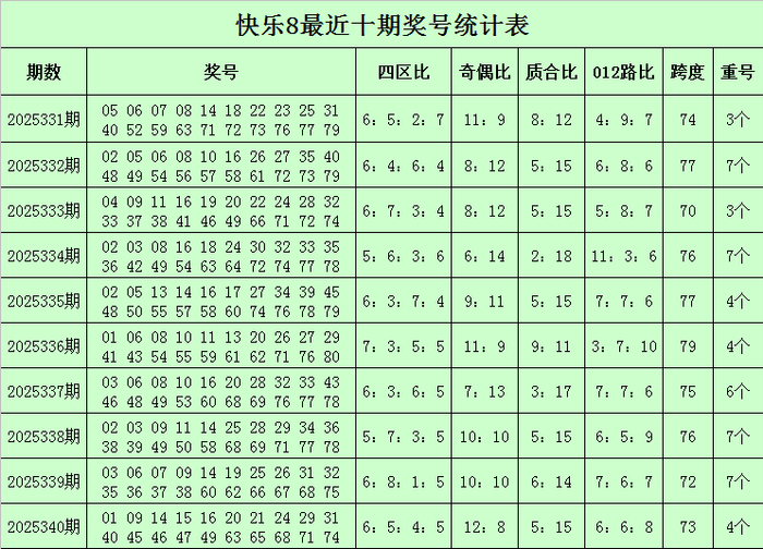 福彩快意8第2025340期开奖致密:01 09 14 15 16 20 21 24 29 31 40 45 46 47 49 63 65 68 71 74,其中奖号四区比为6:5:4:5,奇偶比为12:8,质合比为5:15,跨度为73,012路比为6:6:8,开出4个重号:09、14、31、68。
